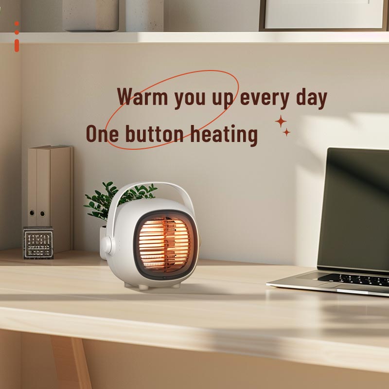 Portable 1200W desktop electric fan heater with ceramic PTC element and safety protections. Compact and efficient, perfect for personal space heating at home or in the bathroom.