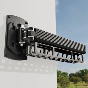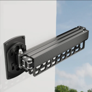 A foldable wall mounted laundry drying rack made from durable carbon steel. Ideal for balconies and indoor spaces with a space-saving expandable design.