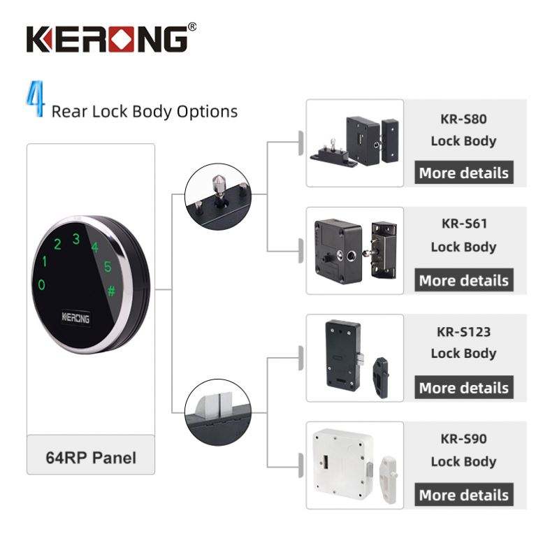 The KERONG KR-64RP cabinet lock features ABS+PC+acrylic construction with password or optional Bluetooth unlocking via the Kerong App. It includes memory-card storage, Grade-C security, 0.1-second response, and motor/servo-driven performance. Powered by battery or USB, it suits gyms, saunas, offices, and similar settings, offering up to 100,000 cycles in gun metal, black, or silver finishes.