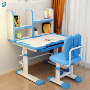 This kids’ learning desk and chair set is designed for comfort, safety, and durability. Made from a combination of board and strong steel, it features adjustable height settings for both the desk (65–71cm) and the chair (38–44cm), supporting proper posture as children grow. Certified by CE, it meets EU safety and quality standards, offering parents peace of mind. With a modern, colorful design available in blue and pink, it fits perfectly in bedrooms, study rooms, or home offices.