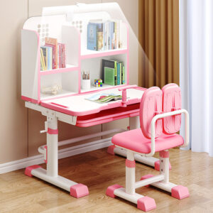 Adjustable kids study desk and chair set with CE certification, sturdy steel frame, ergonomic design, and modern blue/pink finish.