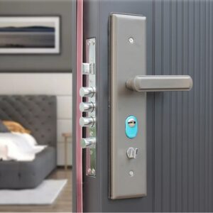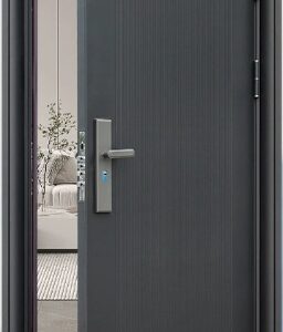 High-security steel entry door with anti-theft features and modern design. Durable, finished exterior ideal for home and commercial entrances.