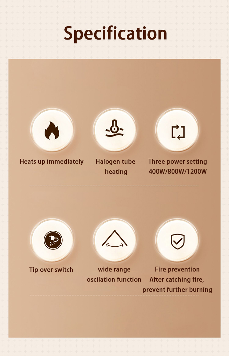 Portable 3-bar halogen heater with oscillation and three power levels (400–1200W). Features tip-over and overheat protection for safe and efficient heating in home, office, or commercial use.