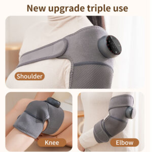 Rechargeable knee massager with 5 heat and vibration levels, made from soft diving fabric. Provides targeted relief for knees, shoulders, and legs with digital control and wrap-lock comfort.