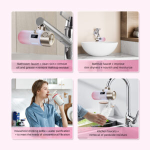 This skincare water purifier faucet delivers clean, safe, and skin-friendly water by removing chlorine, scale, and impurities using high-quality carbon fiber and PP cotton filtration. Designed for easy installation in bathrooms and kitchens, it features eco-friendly construction and simple maintenance. With a high flow rate of 800 GPD and battery-powered operation, it provides reliable performance for home, hotel, or outdoor use. Available in customizable colors, it enhances both water quality and the aesthetic of your space. Enjoy purified water that’s gentle on your skin every day.
