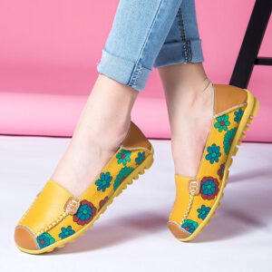 These women’s ballet flats are crafted from genuine leather for a soft, comfortable fit ideal for everyday wear. The breathable pigskin lining enhances comfort, while the rubber midsole and outsole provide stable support for walking. Featuring a round toe and stylish printed pattern, they deliver a trendy yet practical look. Easy slip-on design makes them perfect mom shoes for casual autumn outings.